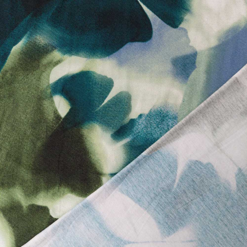Ein weicher Viskose Jersey Stoff bedruckt mit abstraktem Gingko Blättermuster in verschiedenen Grüntönen wie dunkelgrün und hellgrün sowie etwas Jeansblau. Der elastische Jerseystoff ist weich im Griff und fällt wunderbar locker. Die Stoffrückseite ist unbedruckt, d.h. weiß.