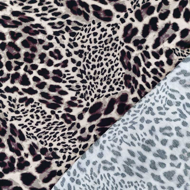Ein weich fließender, hellbeiger Viskose Jersey Stoff bedruckt mit braun schwarzem Leopardenmuster. Der elastische Jerseystoff mit dem Animal Print ist weich und fällt locker. Die Stoffrückseite ist unbedruckt, d.h. grau meliert.