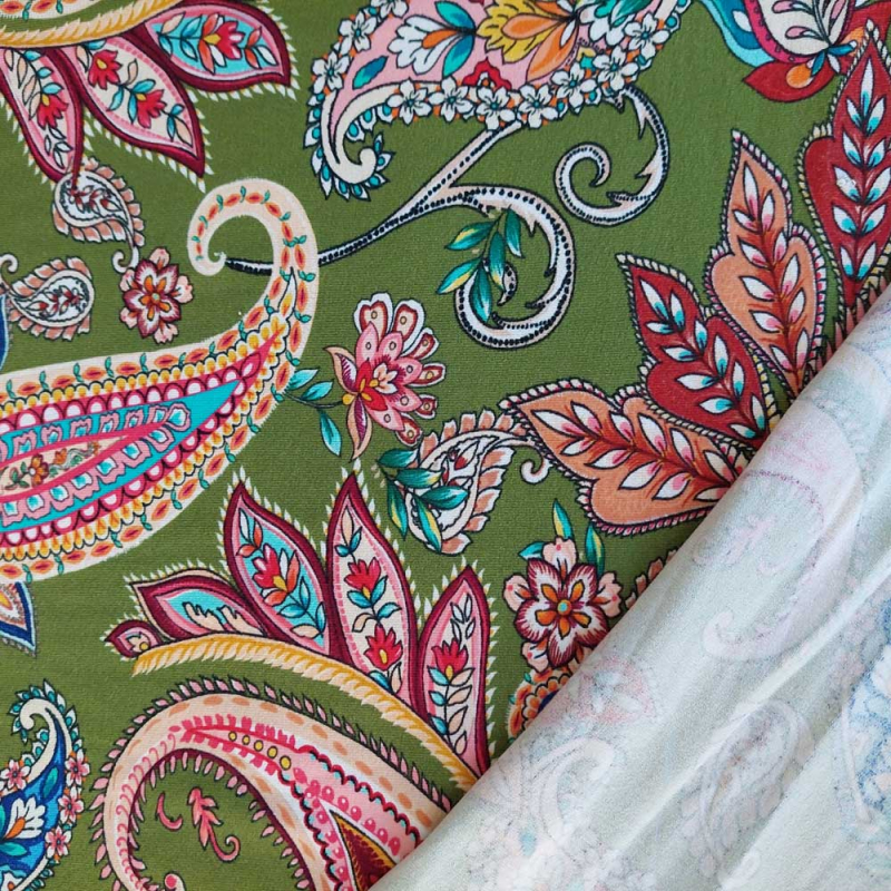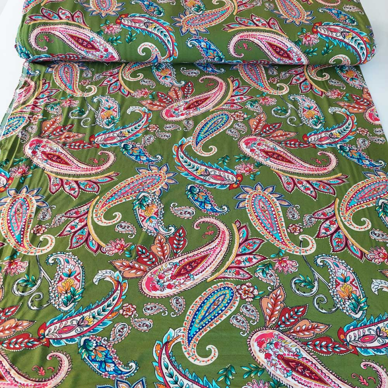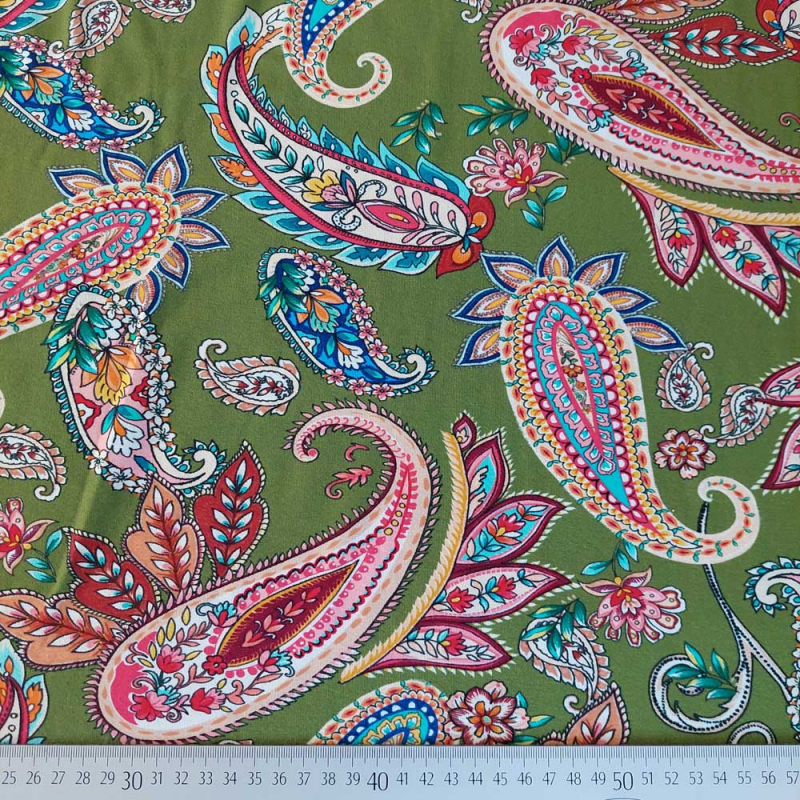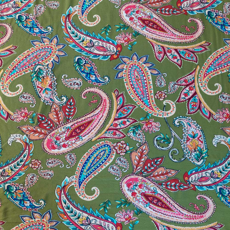 Ein weich fließender, hellgrüner Viskose Jersey Stoff bedruckt mit rosa, weinrot, türkisem Paisleymuster. Der elastische Jerseystoff ist weich im Griff und fällt wunderbar locker. Die Stoffrückseite ist unbedruckt, d.h. weiß.