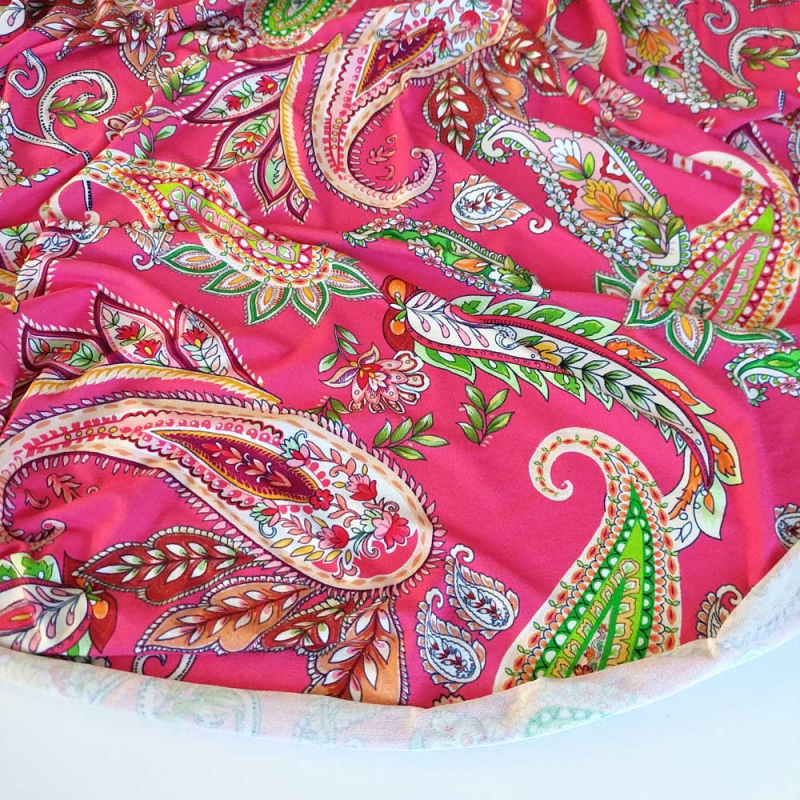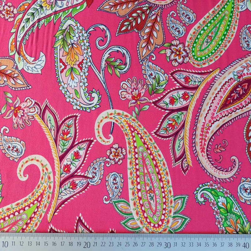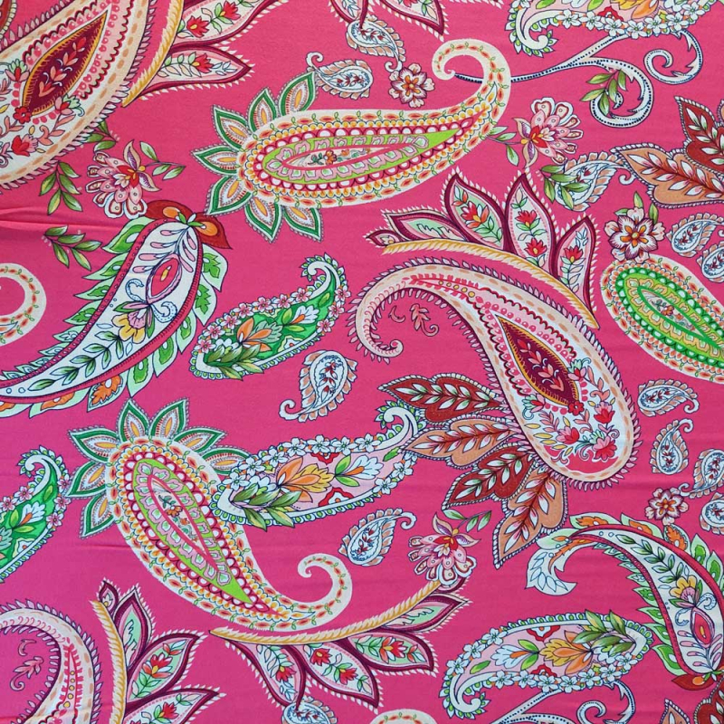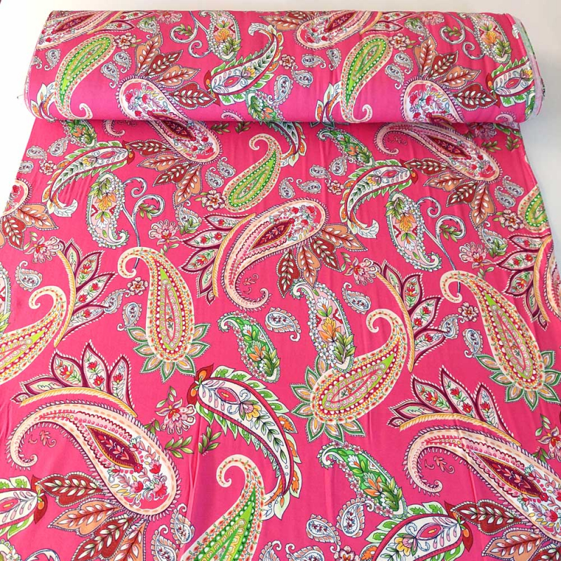 Ein weich fließender, koralle-roter Viskose Jersey Stoff bedruckt mit limegrün, weinrot, weißem Paisleymuster. Der elastische Jerseystoff ist weich im Griff und fällt wunderbar locker. Die Stoffrückseite ist unbedruckt, d.h. weiß.