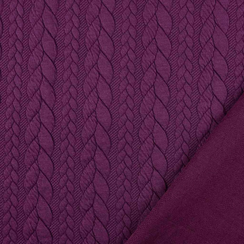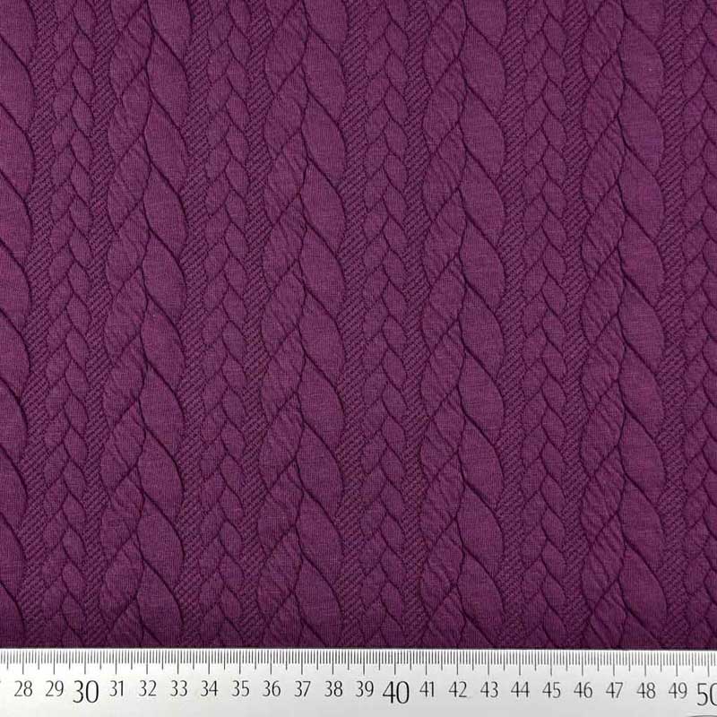 Ein weicher, violetter (helle Pflaume) Jacquard Jerseystoff mit klassischem Zopfmuster. Der Stoff ist elastisch und dehnt sich leicht.