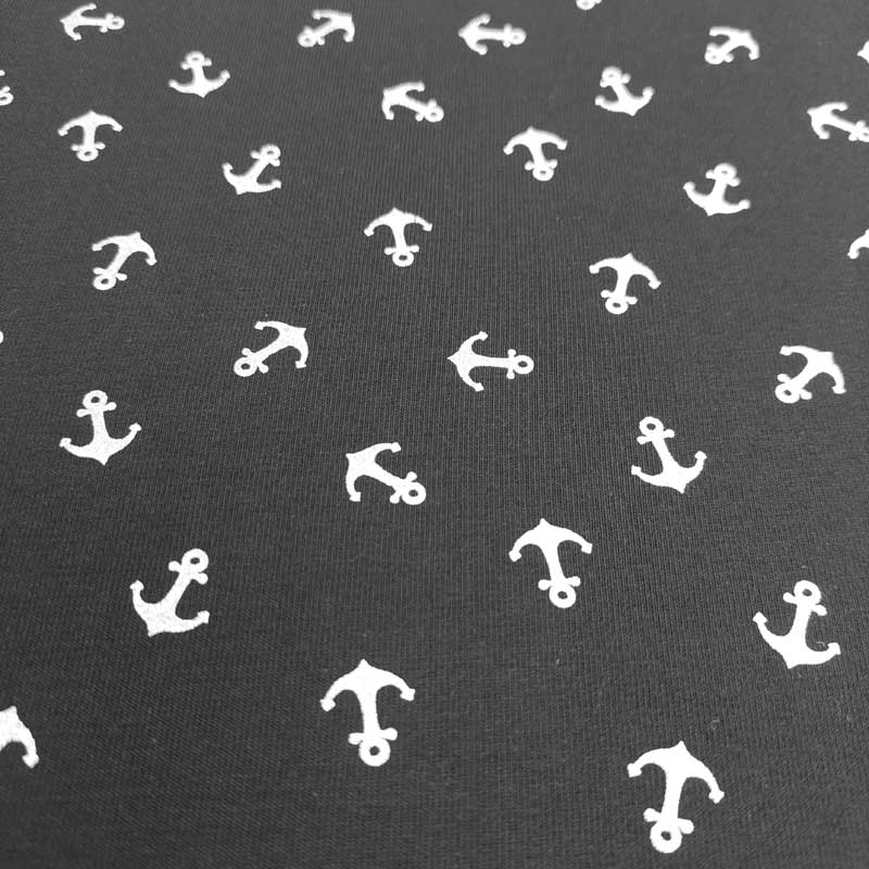Dieser schwarze Baumwolljersey besticht durch ein edles maritimes Design mit kleinen silbernen Ankern im hochwertigen Foliendruck. Der Druck ist auf der Oberfläche spürbar und glänzt in elegantem Silber-Metallic, was dem Stoff eine besondere Ausstrahlung verleiht. Der weiche, atmungsaktive Baumwolljersey bietet angenehme Elastizität und hohen Tragekomfort. Als Jerseystoff Meterware ist er ideal für T-Shirts, Kleider, Hoodies, Röcke, Leggings oder trendige Kinderbekleidung. Die Kombination aus tiefem Schwarz und metallischem Glanz macht diesen Jersey perfekt für moderne, stilvolle Nähprojekte mit besonderem Effekt.