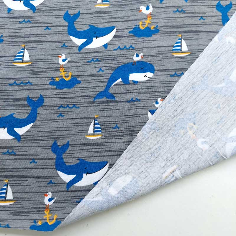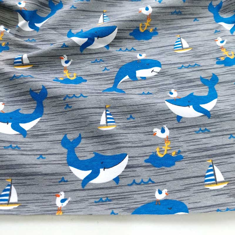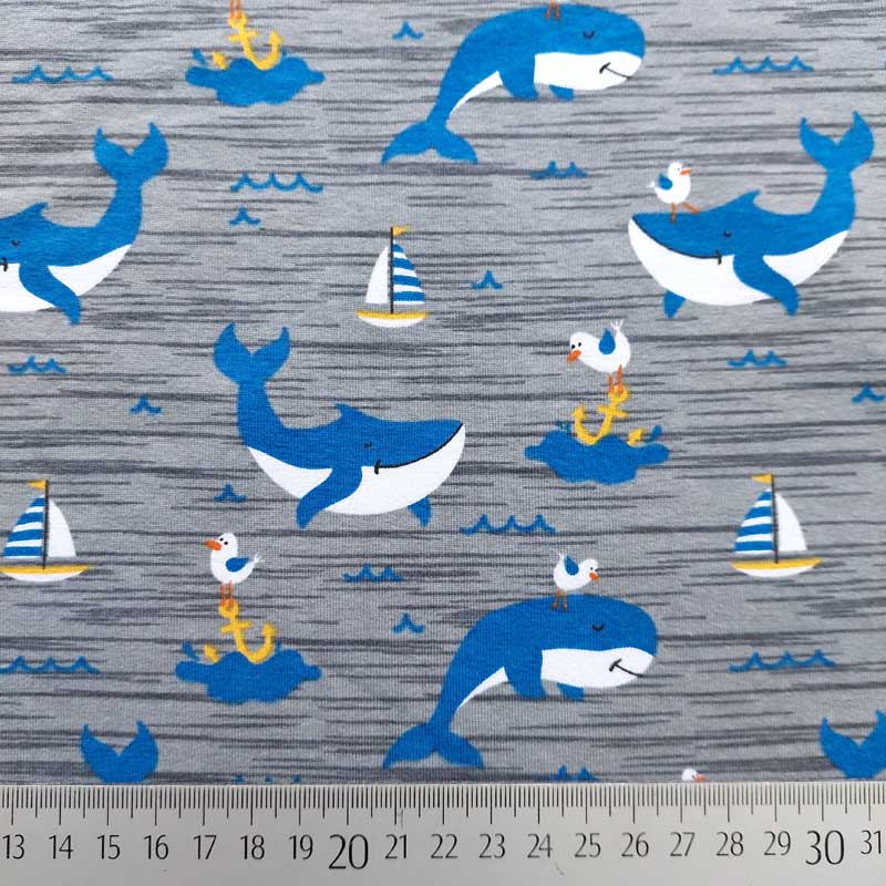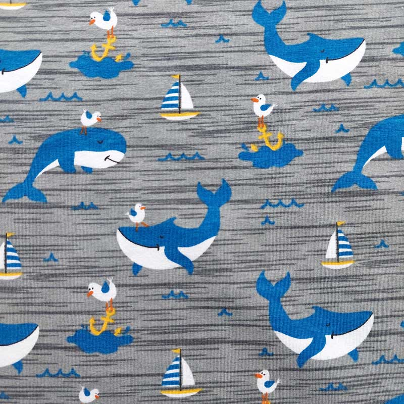 Ein grauer Jerseystoff bedruckt mit mittelblau-weißen Walen, gelb weiß blauen Segelbooten und mittelblauen Wellen. Der T-Shirtstoff ist weich im Griff und leicht elastisch. Die Stoffrückseite ist nicht bedruckt, d.h. weiß.