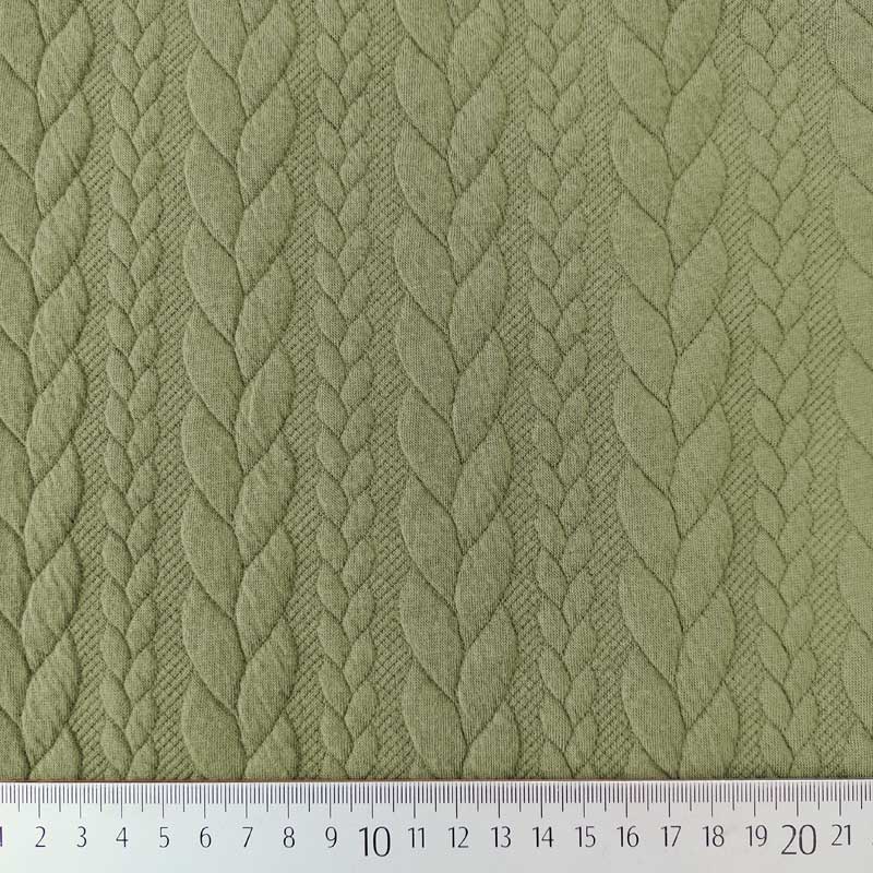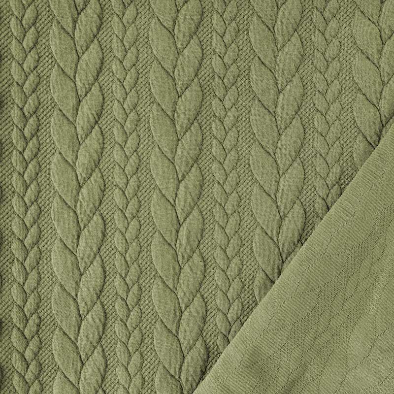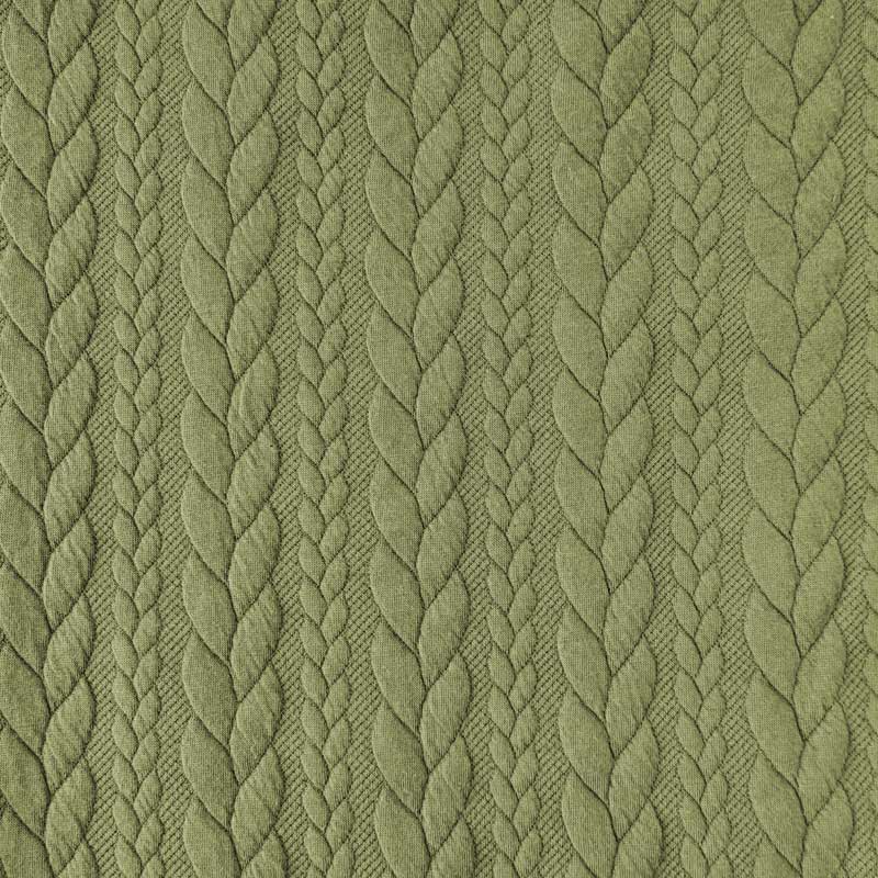 Ein weicher, pistazien-grüner Jacquard Jerseystoff mit klassischem Zopfmuster. Der Stoff ist elastisch und dehnt sich leicht.