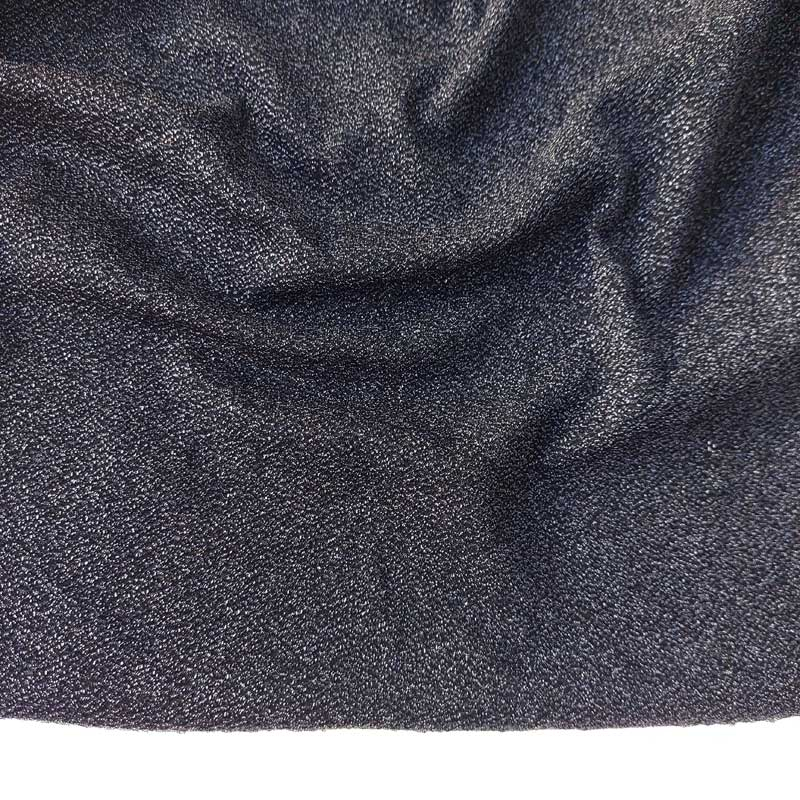 Ein dunkelblauer Jerseystoff mit glitzernder Oberfläche. Je nach Lichteinfall schimmern die eingearbeiteten Metallfäden. Der Jerseystoff ist leicht elastisch und glatt auf der Rückseite.