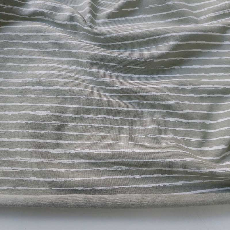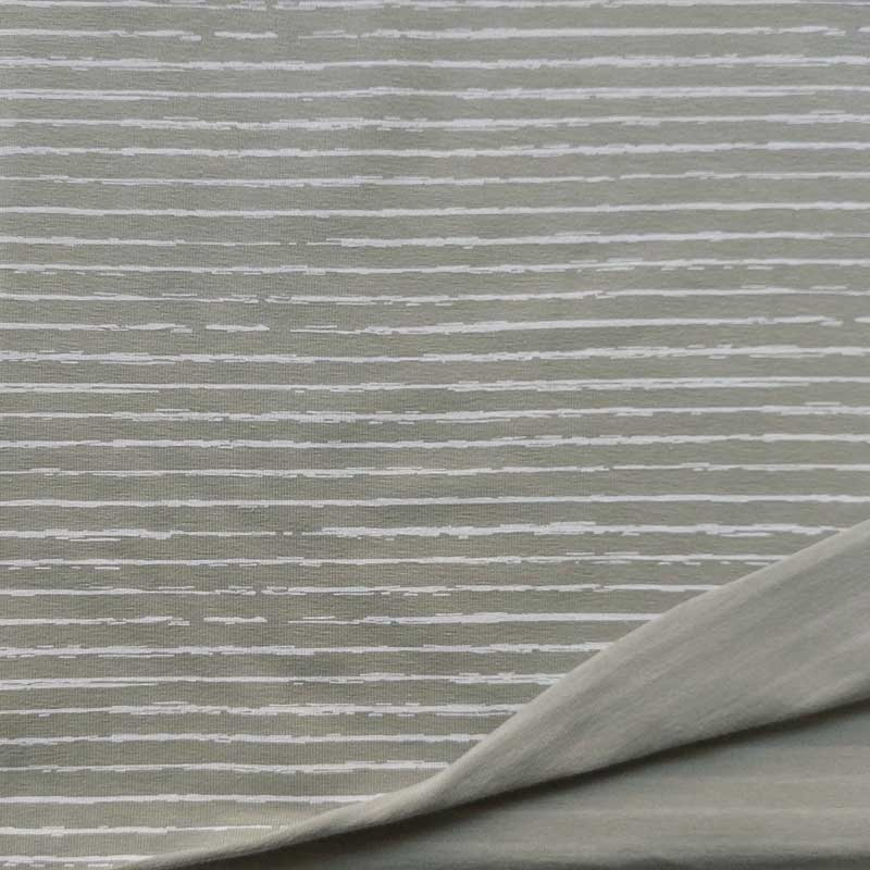 Ein weicher, hell khakigrüner Jerseystoff bedruckt mit weißen, unregelmäßigen Linien. Der Shirtstoff ist weich im Griff und leicht elastisch. Die Stoffrückseite ist nicht bedruckt, d.h. hell khakigrün