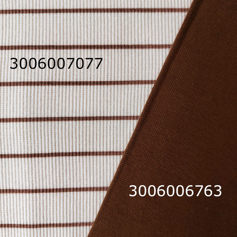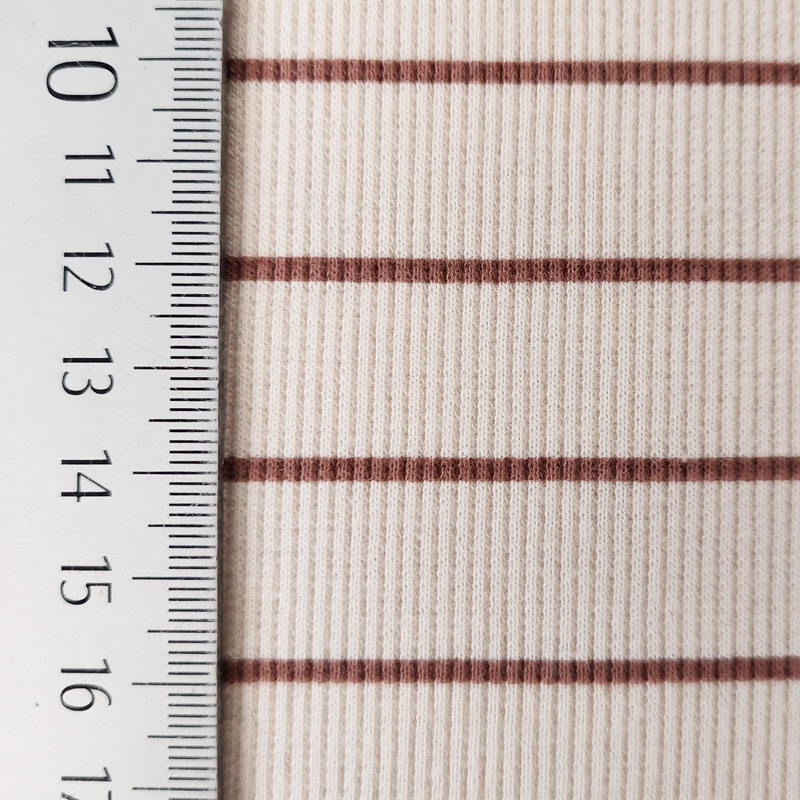 Dieser hellbeige Jersey ist bedruckt mit schmalen braunen Streifen. Die Rückseite ist nur beige.