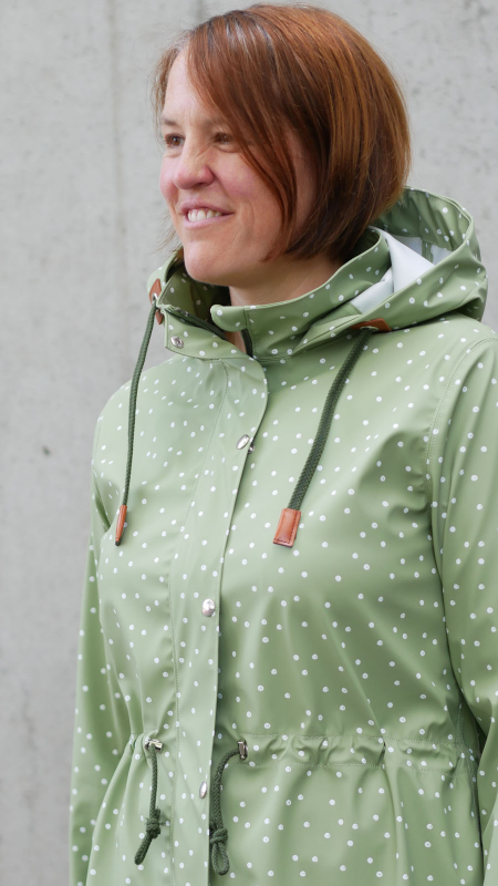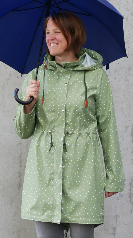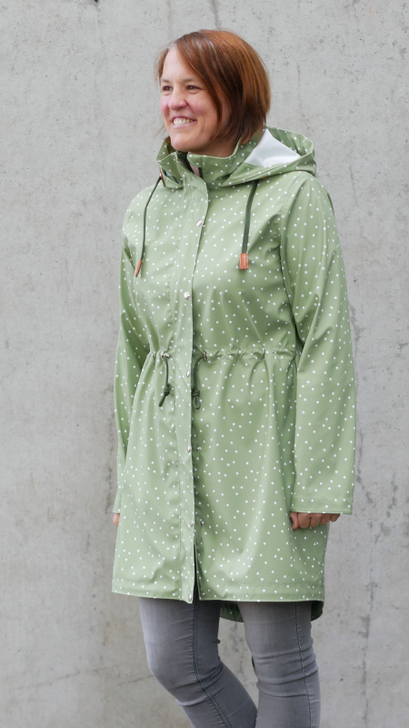 Dieser Stoff ist dünn, wind- und wasserdicht, weich und querelastisch. Somit bietet er einen guten Tragekomfort, trotz jedem Regen und hält trocken. Die textile Rückseite ist unbedruckt, weiß und liegt dank der glatten Struktur angenehm weich auf der Haut.