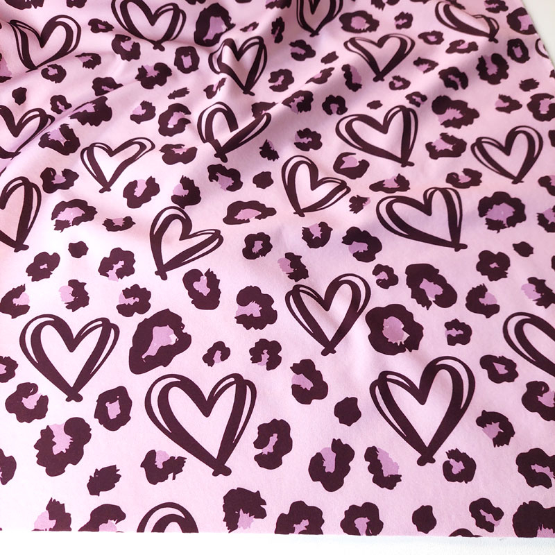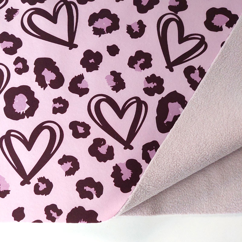 Ein hellrosa Softshell Stoff digital bedruckt mit braun pinken Herzen. Die Rückseite ist aus hellaltrosa Fleecestoff. Der zweilagige Jackenstoff ist windabweisend sowie schmutz- und wasserabweisend. Aufgrund des Elasthananteils ist der Stoff leicht elastisch und hat somit einen guten Tragekomfort.