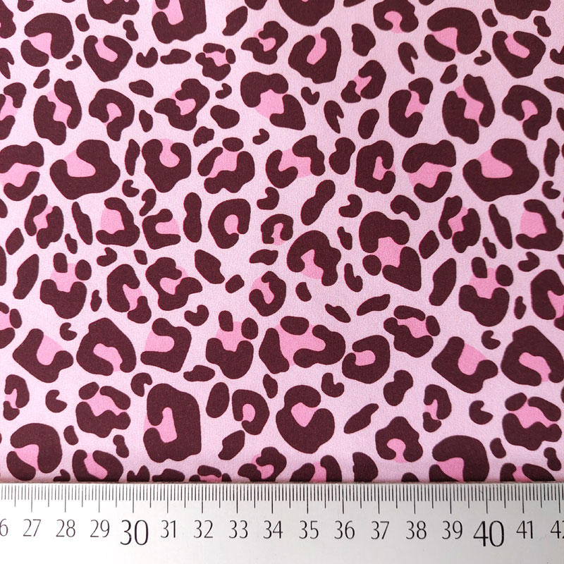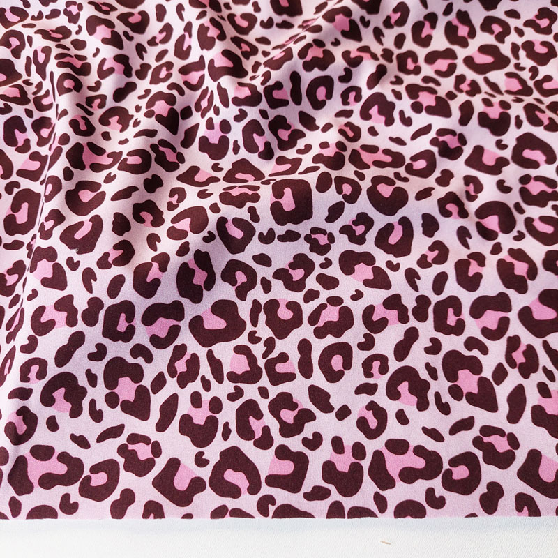 Ein hellrosa Softshell Stoff digital bedruckt mit braun pinkem Leopardenmuster. Die Rückseite ist aus hellaltrosa Fleecestoff. Der zweilagige Jackenstoff ist windabweisend sowie schmutz- und wasserabweisend. Aufgrund des Elasthananteils ist der Stoff leicht elastisch und hat somit einen guten Tragekomfort.