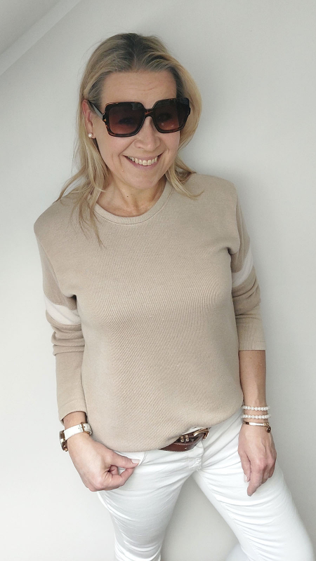 Ein hellbeiger, glatter Strickstoff. Der Strickstoff ist dicht mit einem weichen Griff, leicht elastisch und und fällt weich. Der Tragekomfort ist enorm gut.