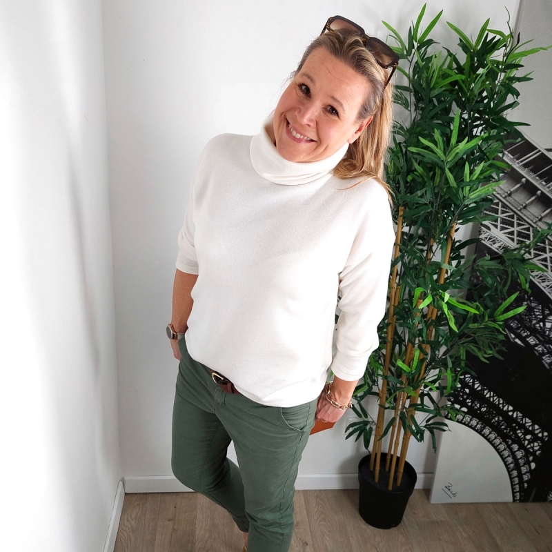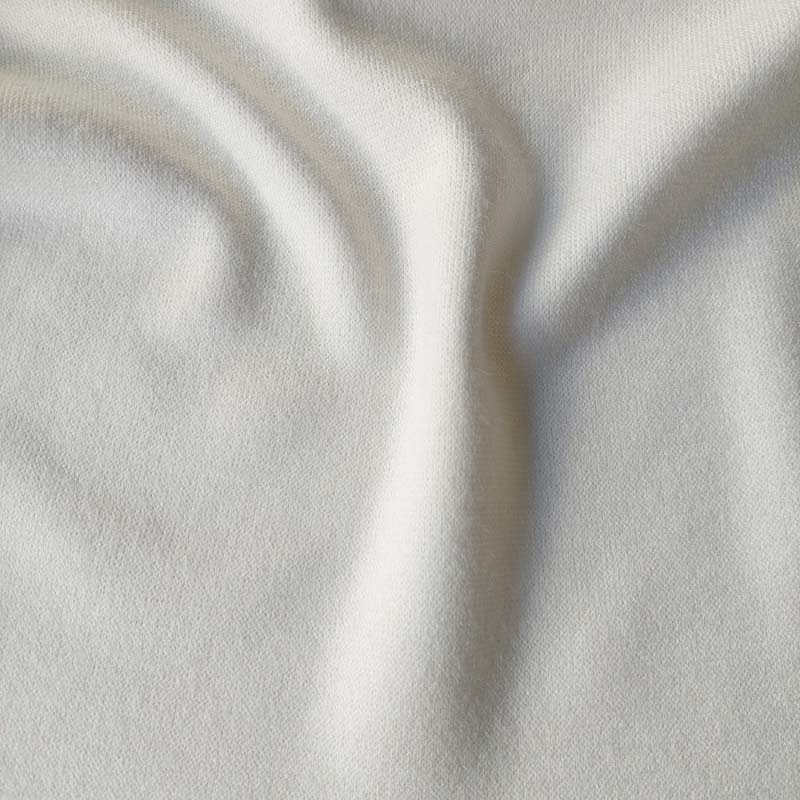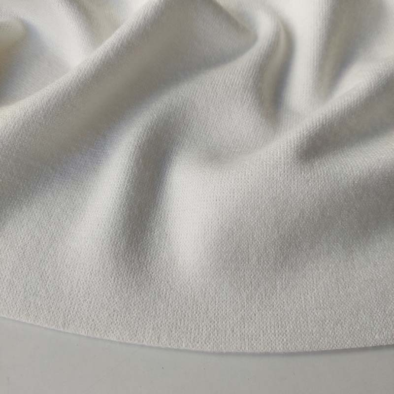 Ein wollweißer, glatter Strickstoff. Der Strickstoff ist dicht mit einem sehr weichen Griff und etwas Stand. Wie für Strick üblich ist er elastisch und bietet somit guten Tragekomfort. Die Vorder- und Rückseite sehen gleich aus.