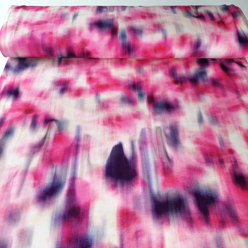 Ein French Terry Sweatstoff bedruckt Batikmuster in Rosa, Pink- und Beeretönen sowie Lila und Blau.
