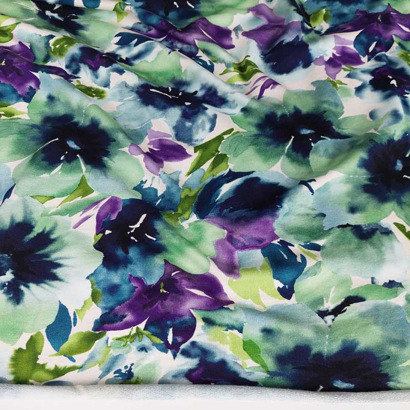 Ein French Terry Sweatstoff bedruckt mit blau lila grünem Blumenmuster.
