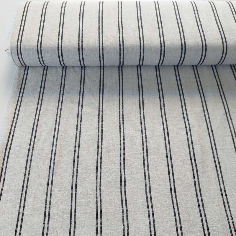 Dieser elegante, beige (natur) Viskose-Leinen Stoff mit klassischen schwarzen Doppelstreifen in Längsrichtung verbindet sommerliche Leichtigkeit mit einem weichen, lockeren Fall. Durch den Viskoseanteil fühlt sich der Stoff angenehm weich auf der Haut an, während das Leinen dem Stoff einen natürlichen Charakter verleiht.