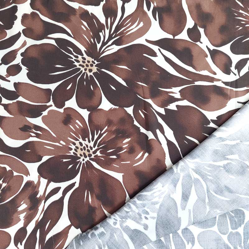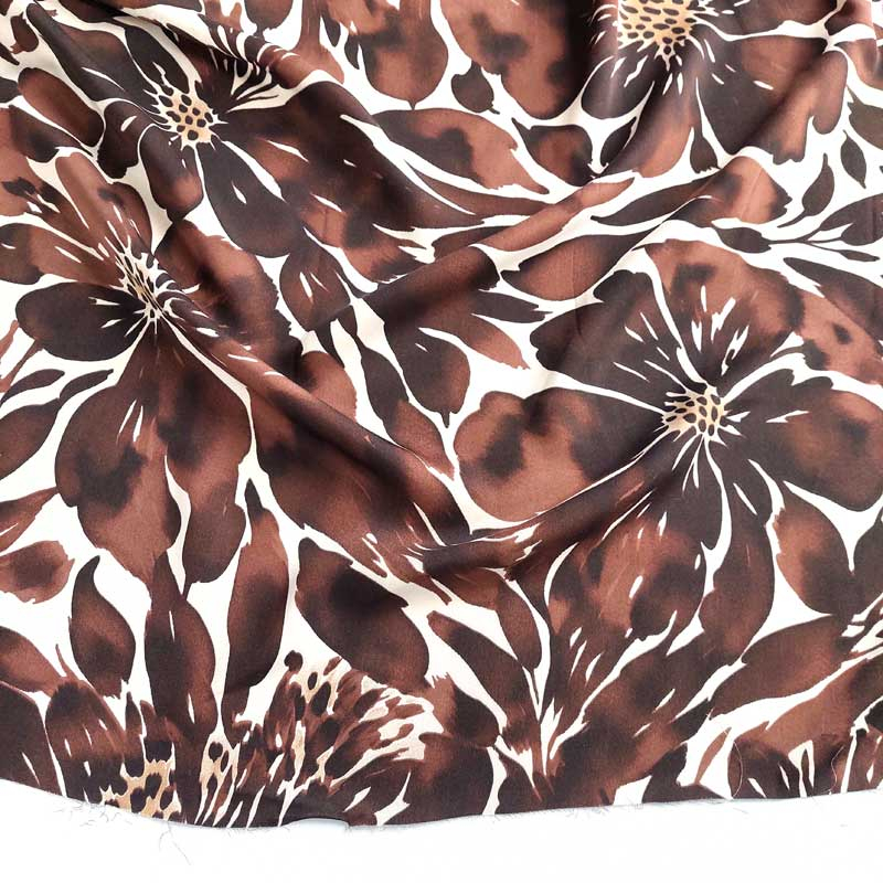 Veredeln Sie Ihre Garderobe mit diesem edlen 100% Viskose Satin Stoff. Das Design besticht durch einen kontrastreichen Look: Auf weißem Fond präsentiert sich ein großflächiger Blumen-Druck in tiefem Dunkelbraun, der durch kunstvolle, hellere Akzente eine besondere Lebendigkeit erhält.