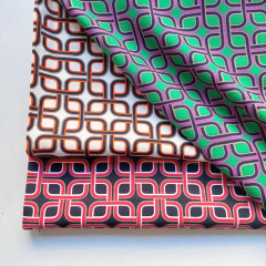 Ein schwarzer Viskose Twillstoff bedruckt mit rot weiß taupe-farbigen Quadrate, die ein grafisches Muster bilden. Der Twillstoff ist weich im Griff mit einem lockeren Fall. Das Webbild zeichnet sich beim Twillstoff durch feine diagonal verlaufende Linien aus.