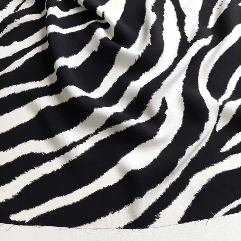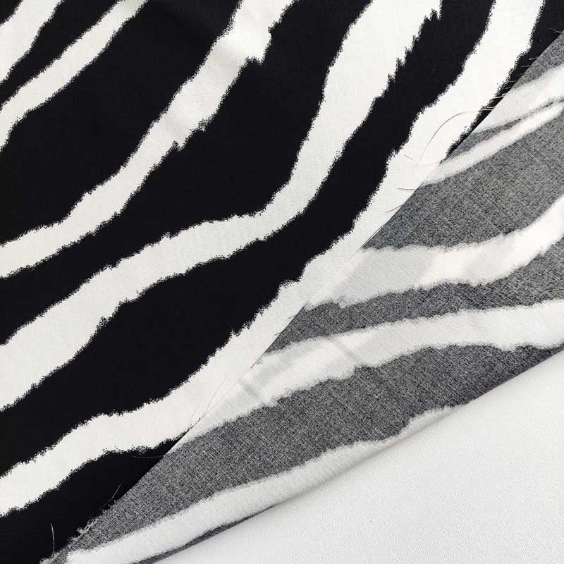 Dieser schwarz-weiße Viskose Stoff mit modernem Zebramuster ist ein echter Hingucker für stilvolle Nähprojekte. Aus 100 % Viskose gefertigt, überzeugt er durch seine leichte Qualität, einen besonders weichen Griff und einen elegant fließenden Fall. Der Stoff fühlt sich angenehm kühl auf der Haut an und ist damit ideal für warme Tage. Als Viskose Stoff Meterware kaufen Sie ihn perfekt für individuelle Modeideen. Ob luftige Kleider, Blusen, Tuniken, Röcke, Hosen oder Jumpsuits – dieser Viskose Stoff für Kleid und andere Sommermode lässt sich vielseitig verarbeiten. Ein perfekter Viskose Stoff Sommer für kreative, selbstgenähte Lieblingsstücke.